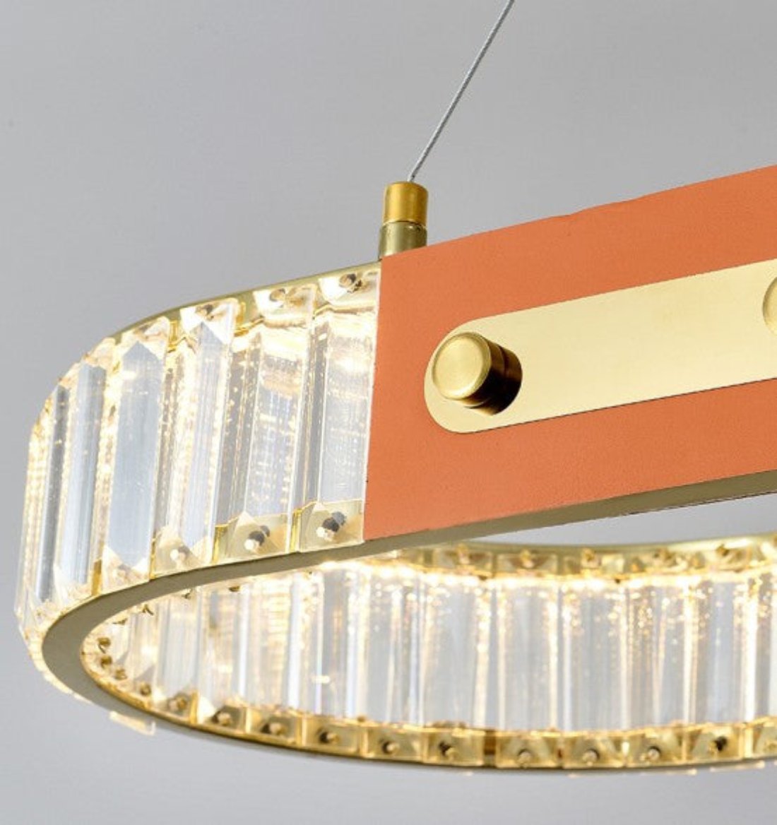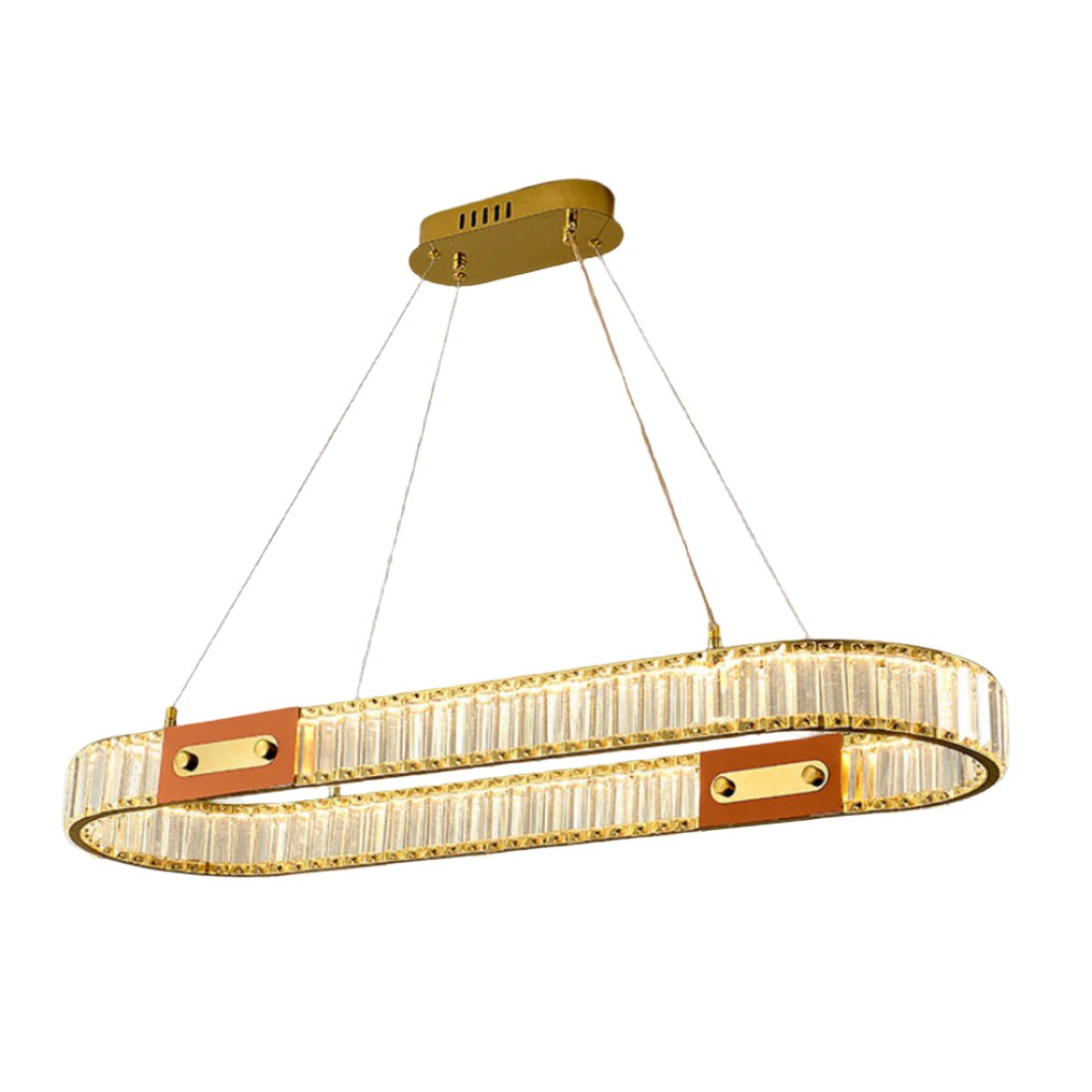 This elegant oval-shaped crystal chandelier is a perfect blend of modern design and classic luxury. Featuring two concentric oval rings, the outer ring is adorned with numerous clear, sparkling crystals that reflect light beautifully, creating a dazzling display. The inner ring and the fixtures base boast a polished copper finish, adding a touch of sophistication. Suspended from the ceiling by three slender cables, this chandelier appears to float, enhancing its contemporary aesthetic. Ideal for both contemporary and traditional decors, this lighting piece promises to be a stunning focal point in any high-end living space, dining area, or grand foyer.
