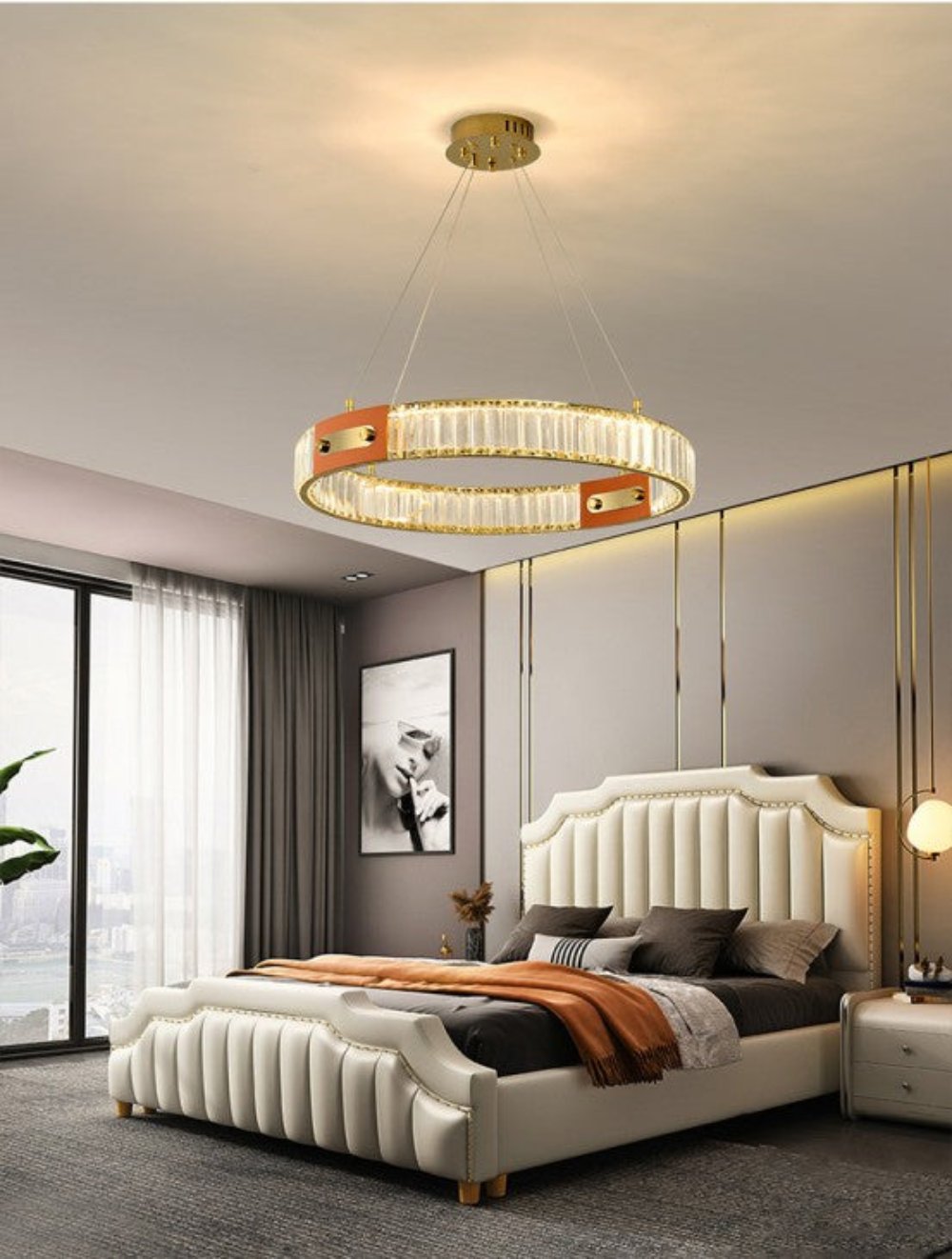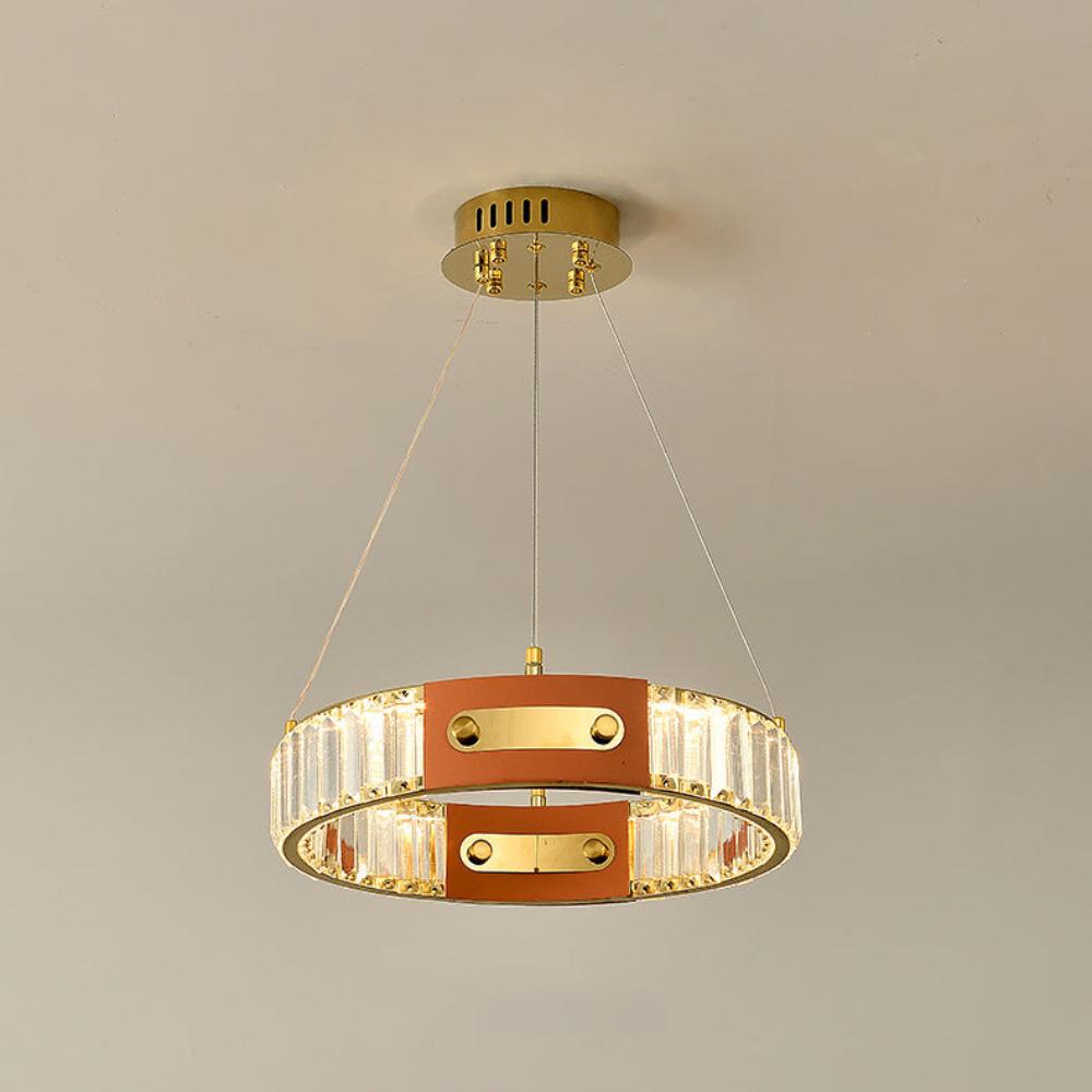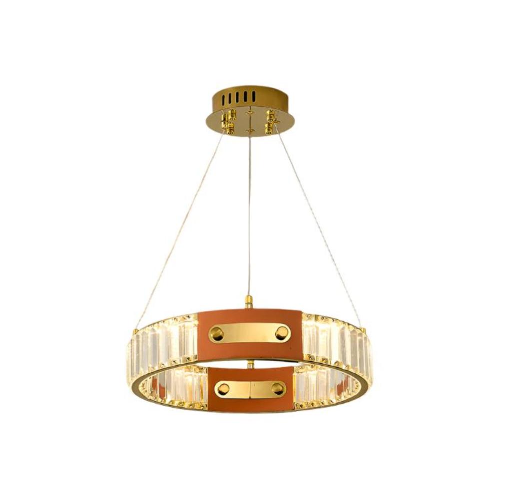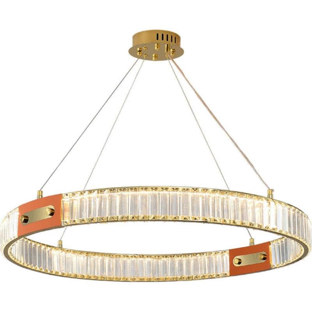This exquisite modern crystal chandelier is the epitome of luxury and elegance. Featuring a sleek, circular design, it boasts two concentric rings suspended from a polished gold ceiling mount by three slender cables. Each ring is meticulously adorned with rectangular crystals, creating a seamless cascade of sparkling light. The inner and outer rings are connected by elegant gold spacers, enhancing the fixture? opulent appeal. Perfect as a centerpiece in high-end living spaces, dining areas, or grand foyers, this chandelier promises to bathe any room in a warm, inviting glow while making a bold statement of refined taste.
