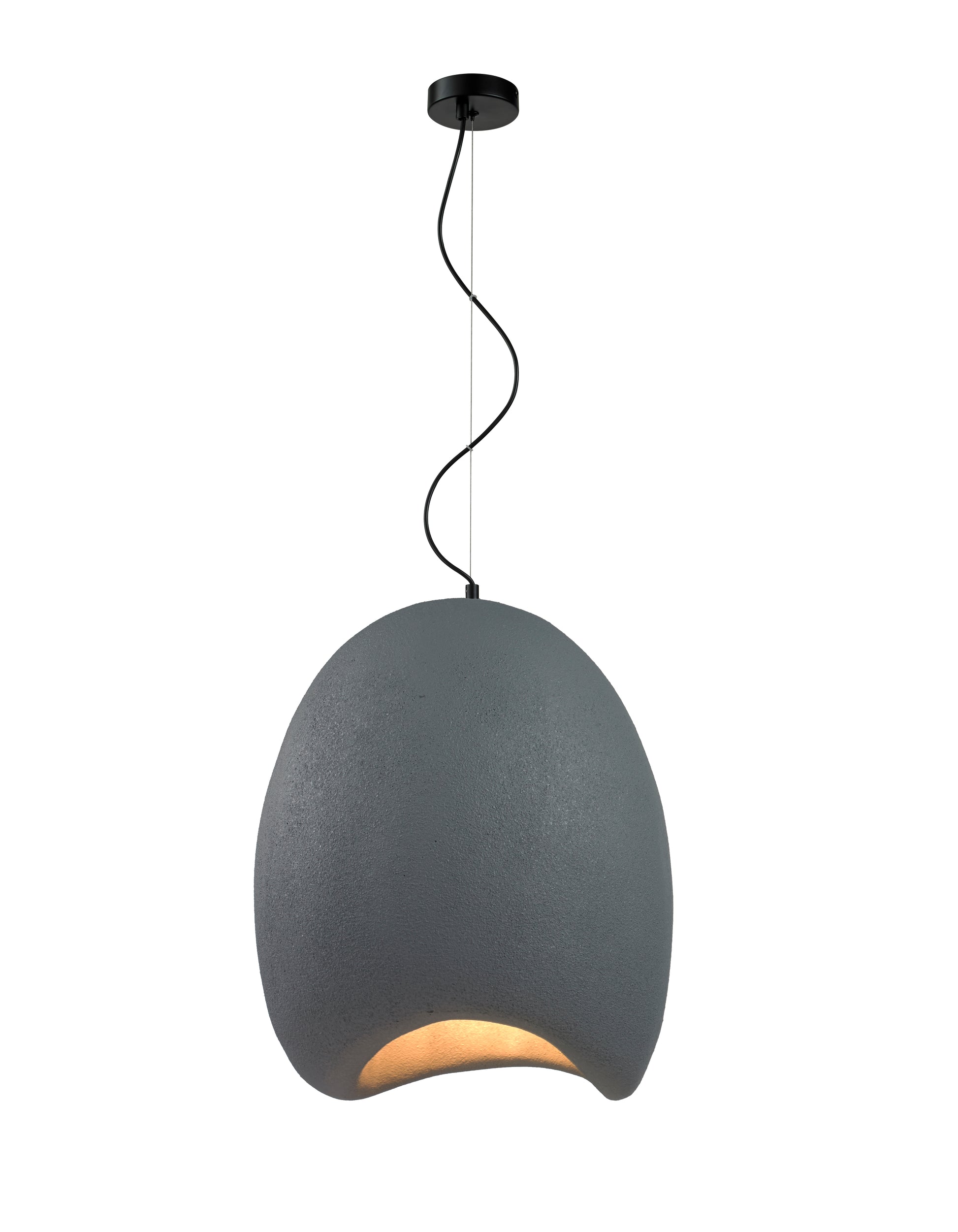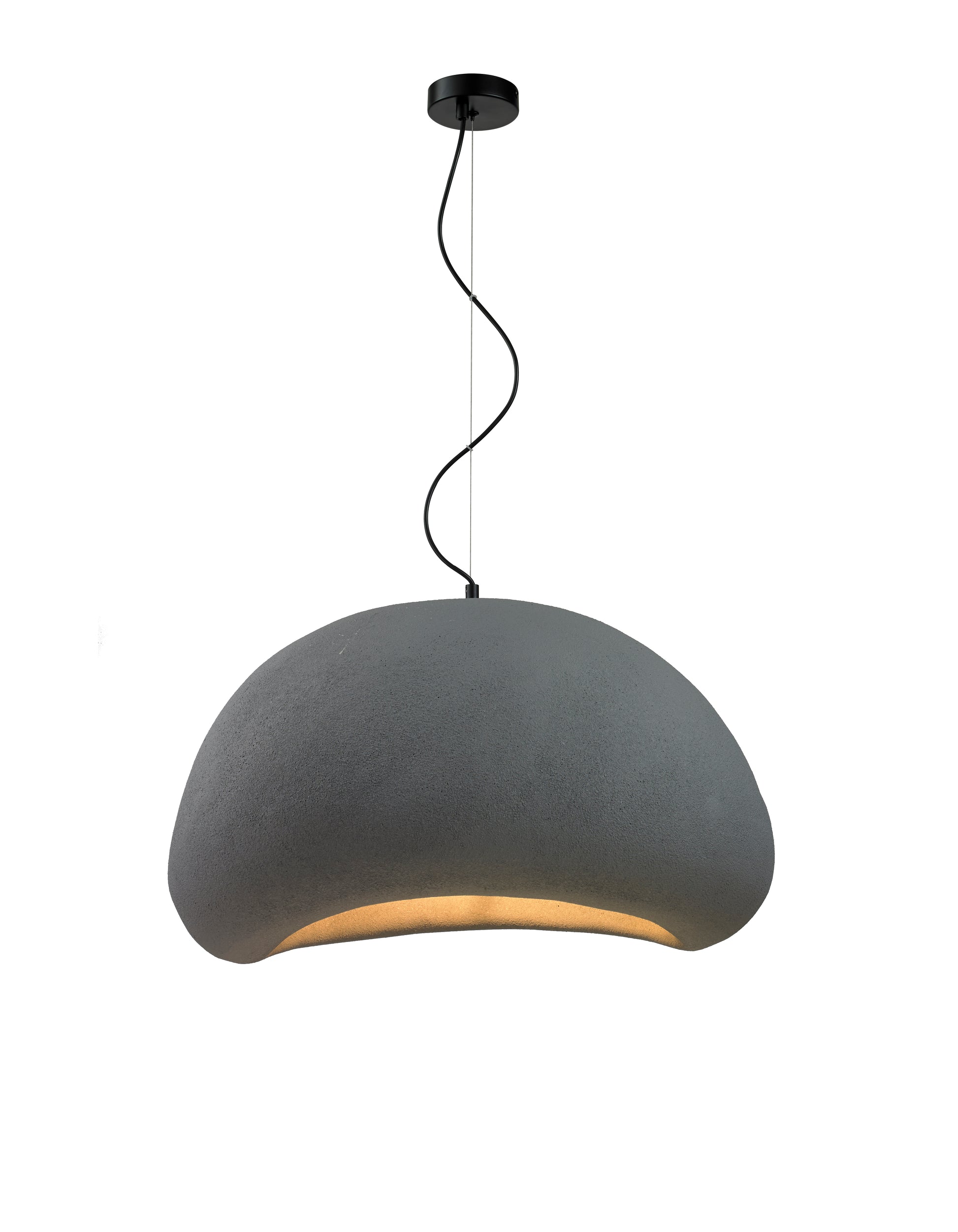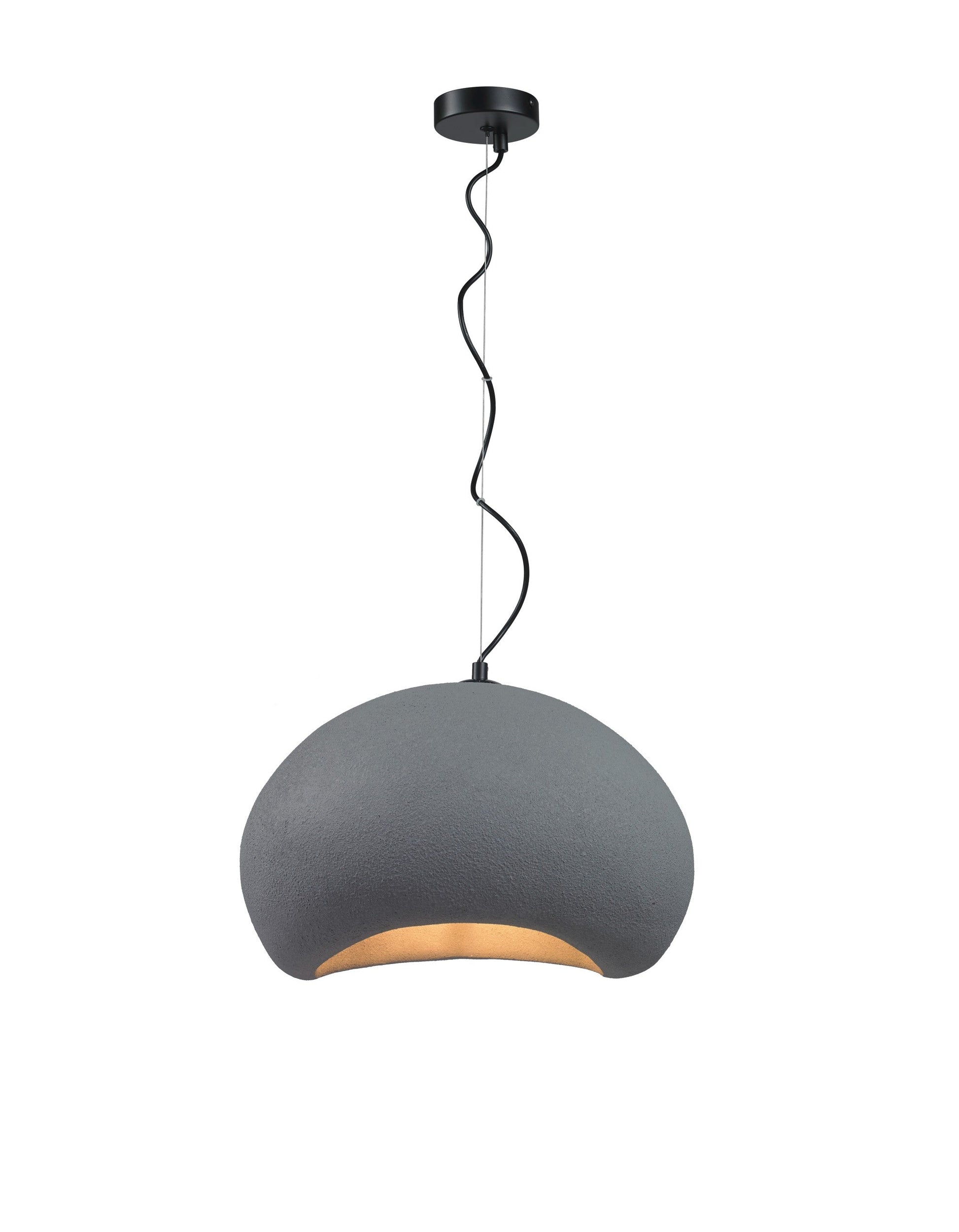 This modern pendant light fixture is a perfect blend of elegance and contemporary style. Featuring a large, dome-shaped fibera glass shade with a textured dark exterior, it exudes sophistication. The interior of the dome is finished in a warm gold tone, providing a stunning contrast that enhances its visual appeal and ensures a warm, inviting glow when illuminated. Suspended from a sleek black cable that gracefully curls at the top before connecting to a matching black ceiling canopy, this pendant light is an exquisite statement piece. Ideal for dining areas, living rooms, or entryways, it combines functionality with high-end design, making it a luxurious addition to any space.