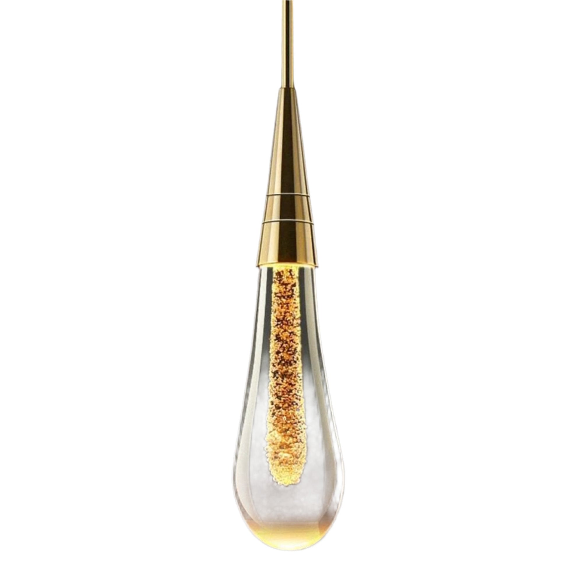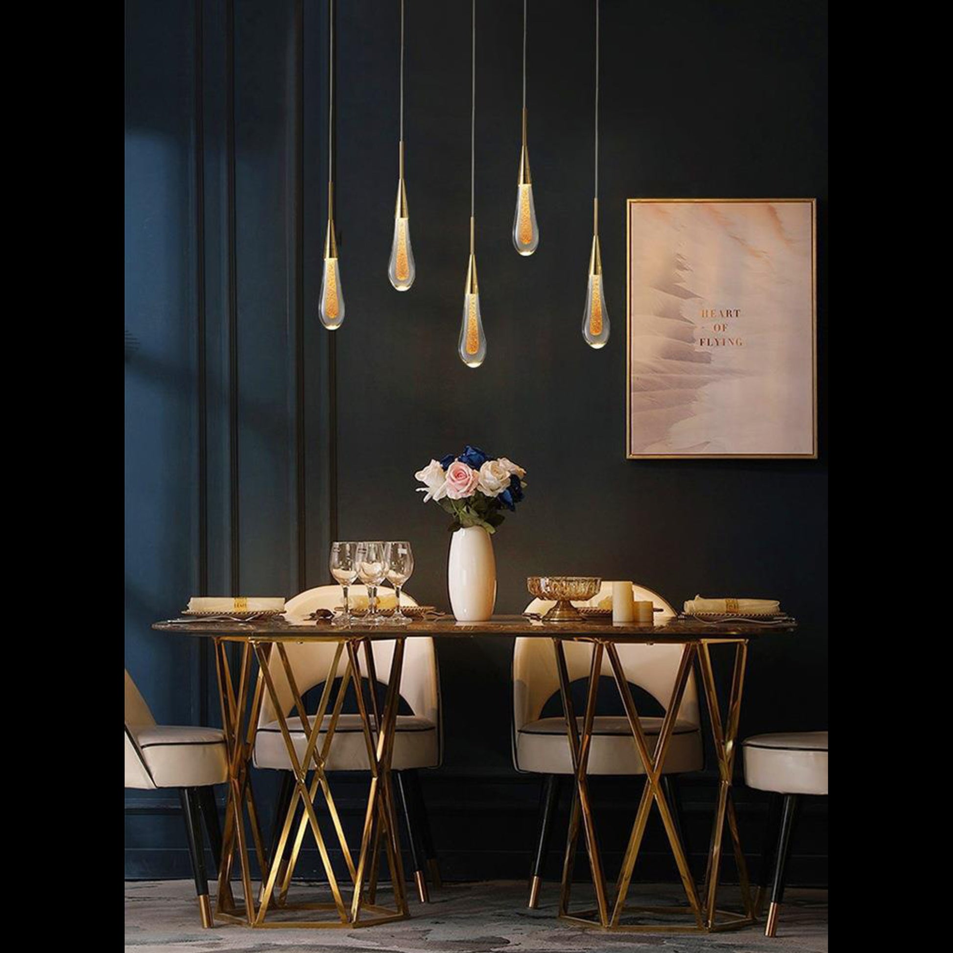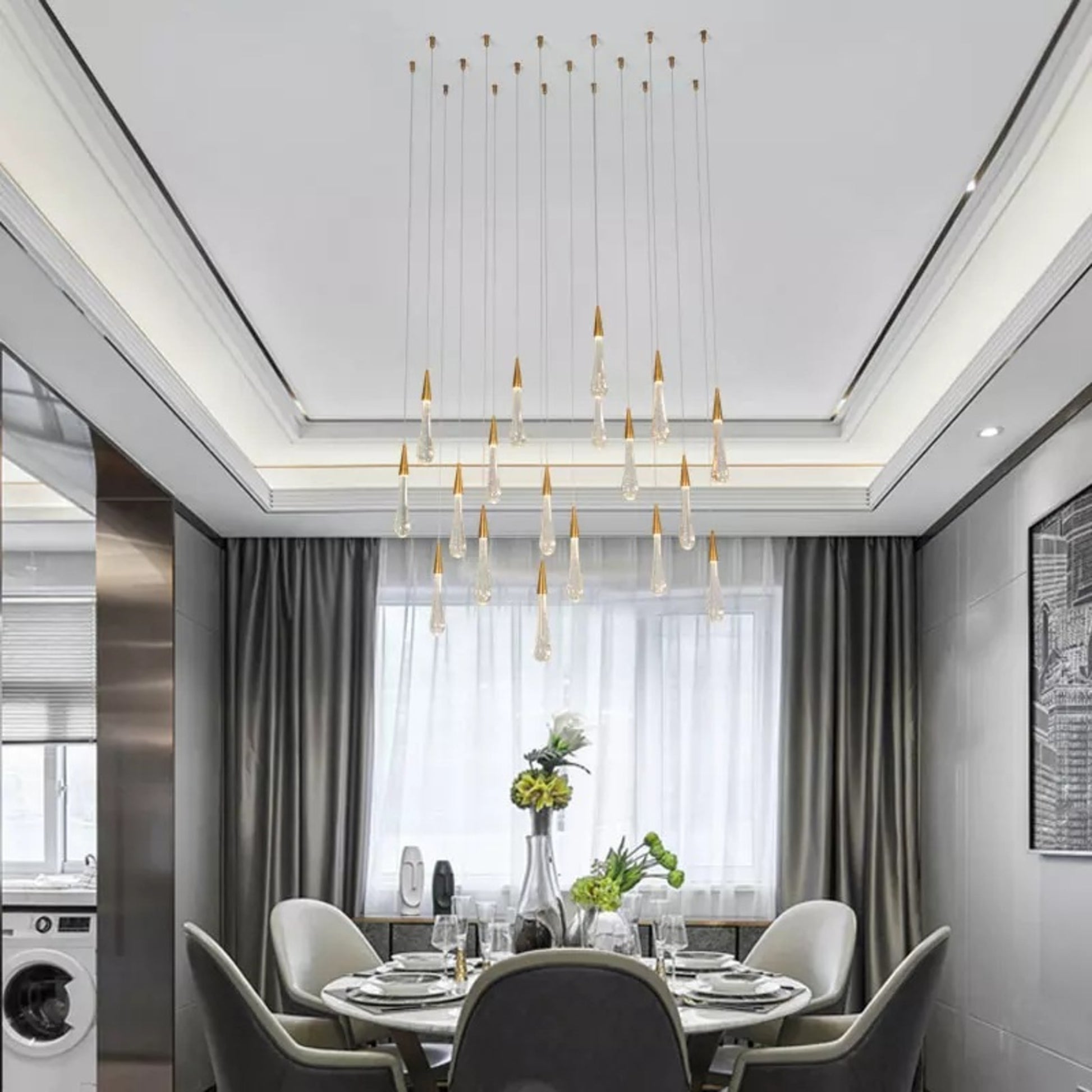 This luxurious pendant light fixture is a stunning blend of modern elegance and sophistication. Featuring a collection of slender, vertical elements that cascade gracefully from a circular canopy, each element is designed with a sleek, cylindrical body that tapers to a point, reminiscent of icicles or stalactites. The high-quality materials, with a metallic finish in brass or gold, add a touch of opulence. This pendant light creates a dramatic visual impact, making it an exquisite statement piece for any high-end interior space. Perfect for adding ambient illumination and an artful aesthetic, it promises to elevate the style of dining areas, living rooms, or grand foyers.