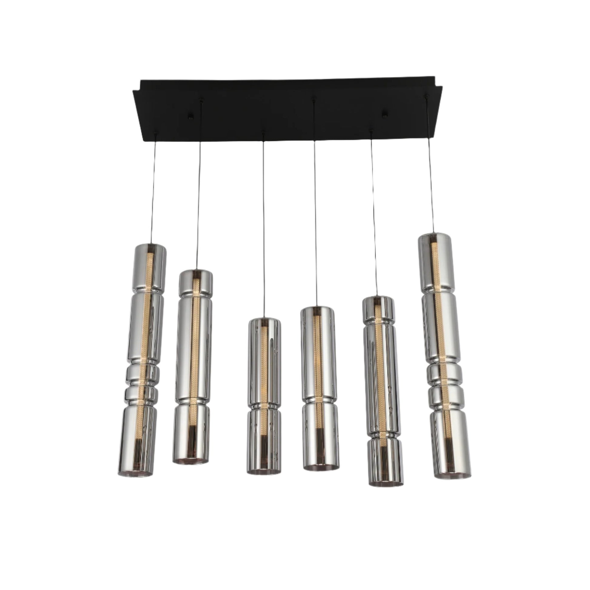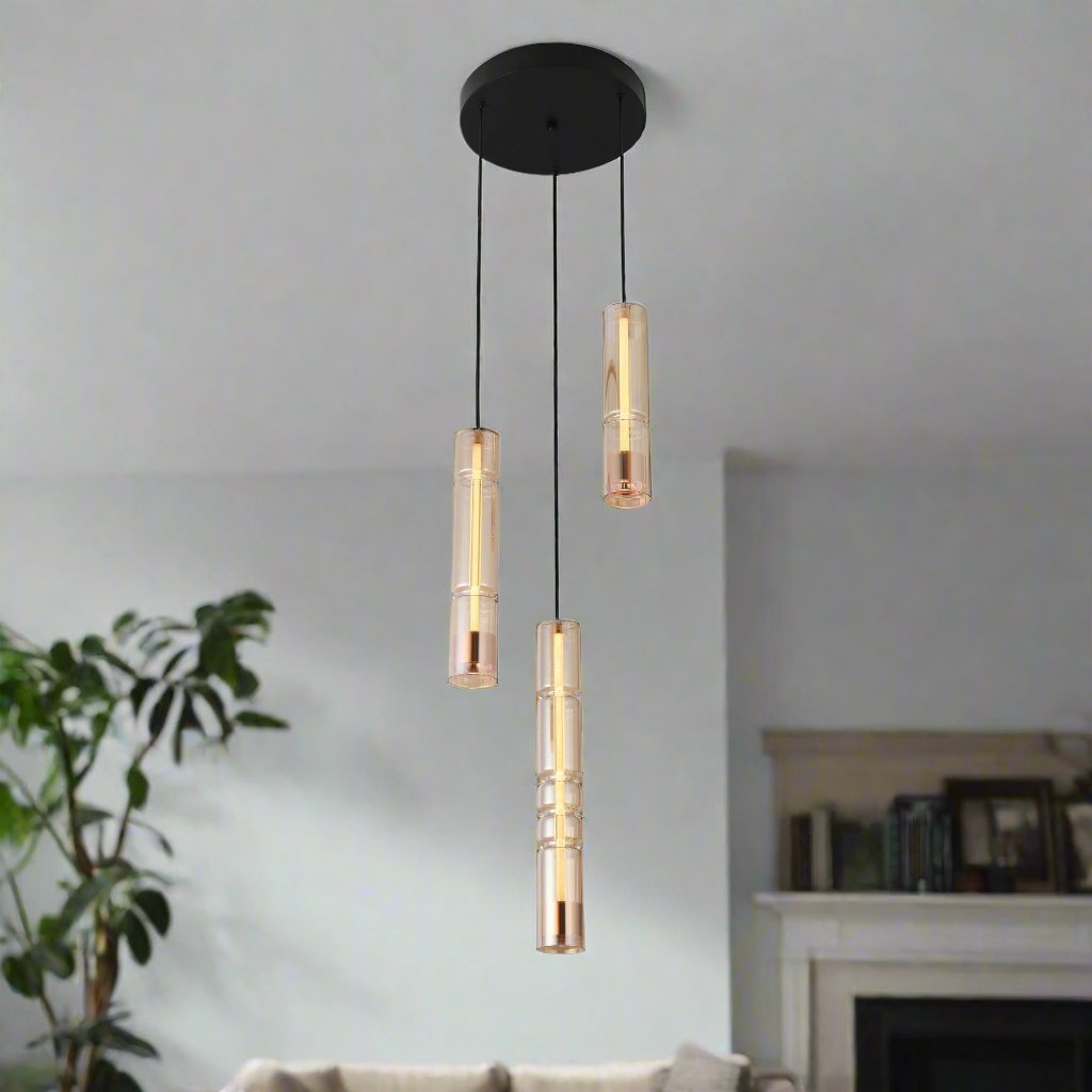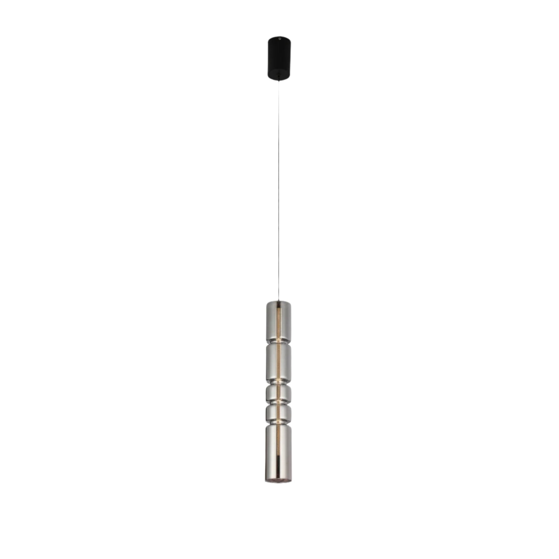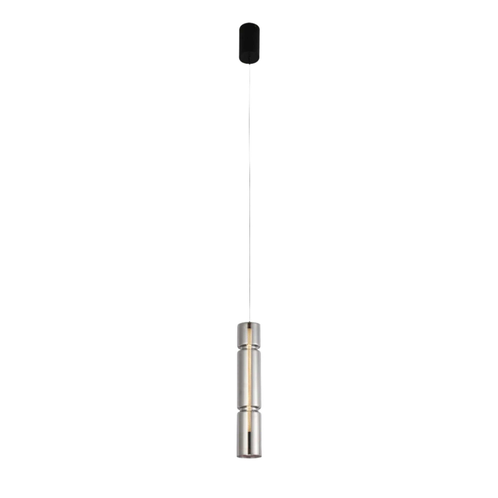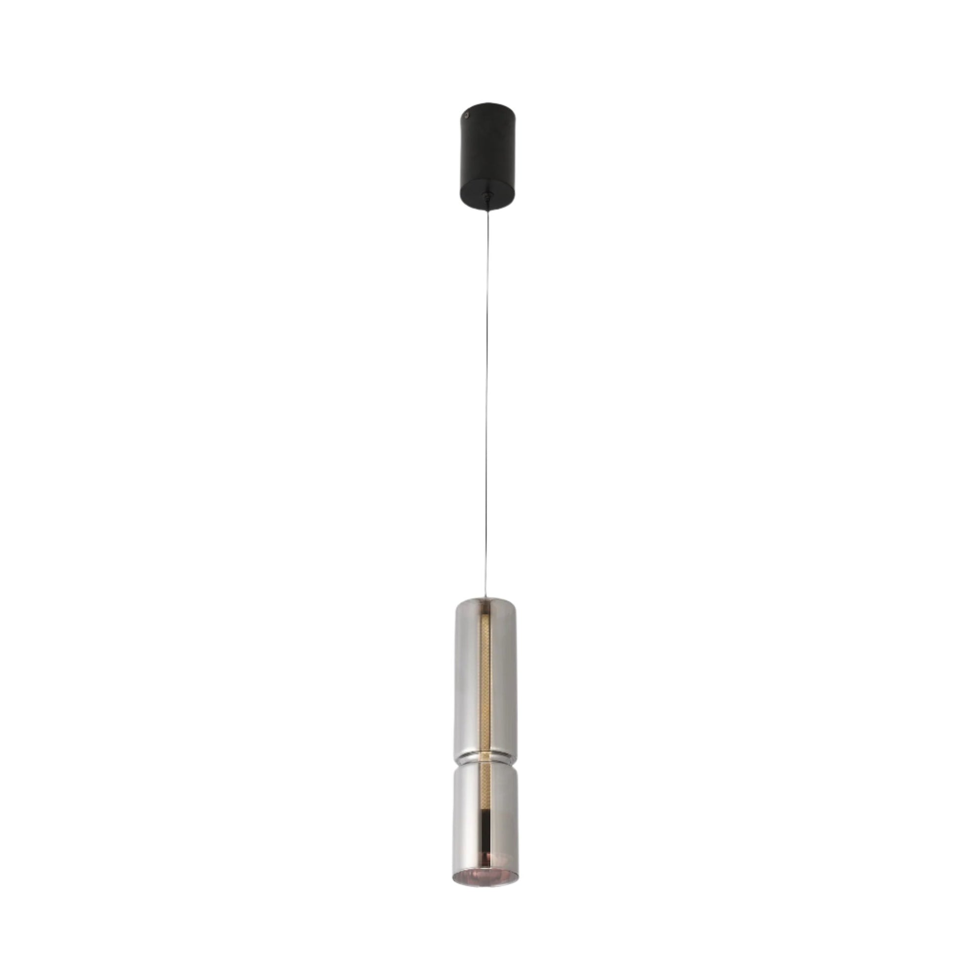 This exquisite glass pendant light is a captivating blend of modern artistry and timeless elegance. Its cylindrical form, meticulously crafted with high-quality glass, features a mesmerizing interplay of light and shadow. The upper portion of the pendant boasts a shimmering metallic finish, while the lower section reveals a warm, copper-toned interior. This striking contrast creates a captivating visual effect, casting a warm and inviting glow when illuminated. The pendant's minimalist design, suspended by a slender black cord, exudes a sense of understated luxury. It is a statement piece that effortlessly elevates any interior space, adding a touch of sophistication and refinement