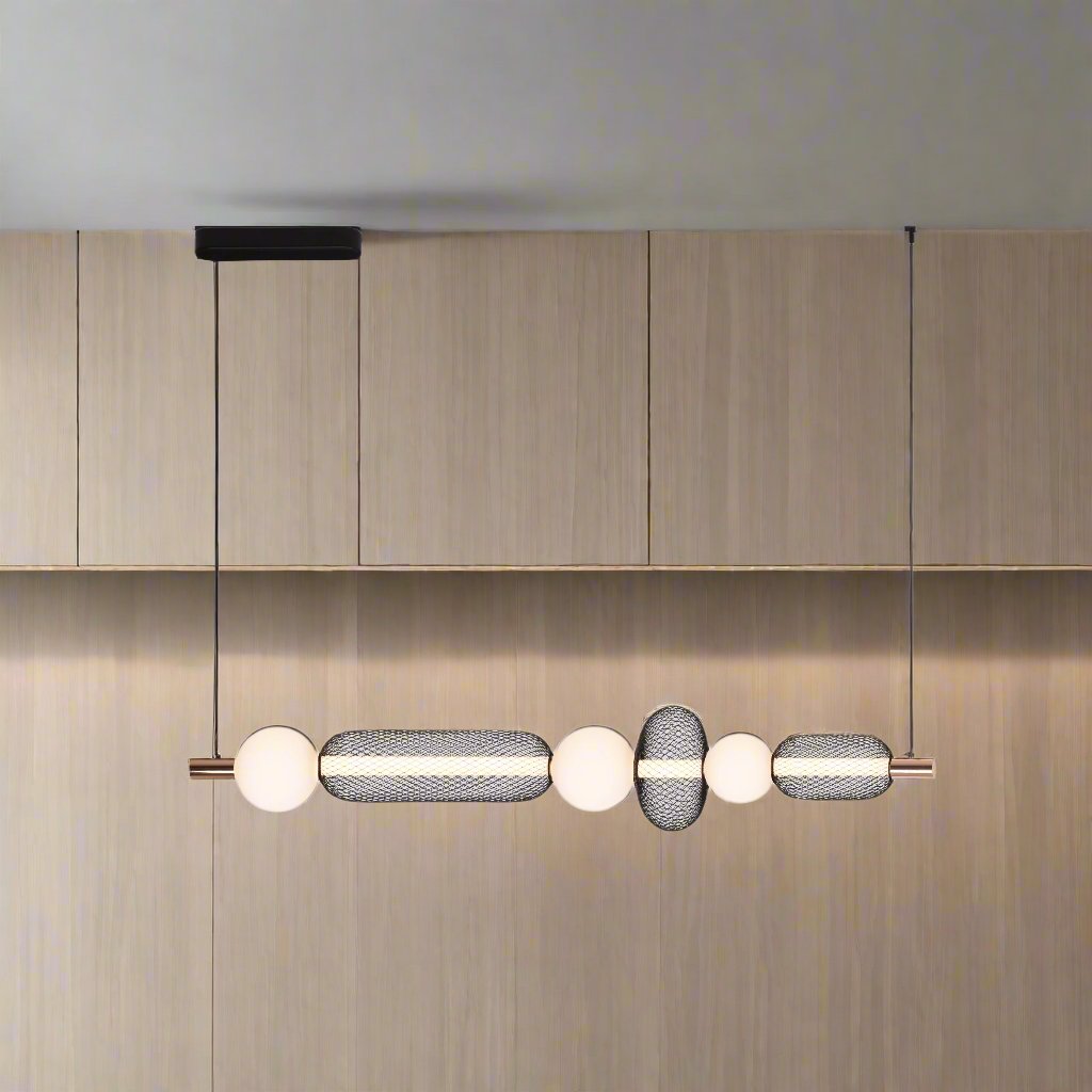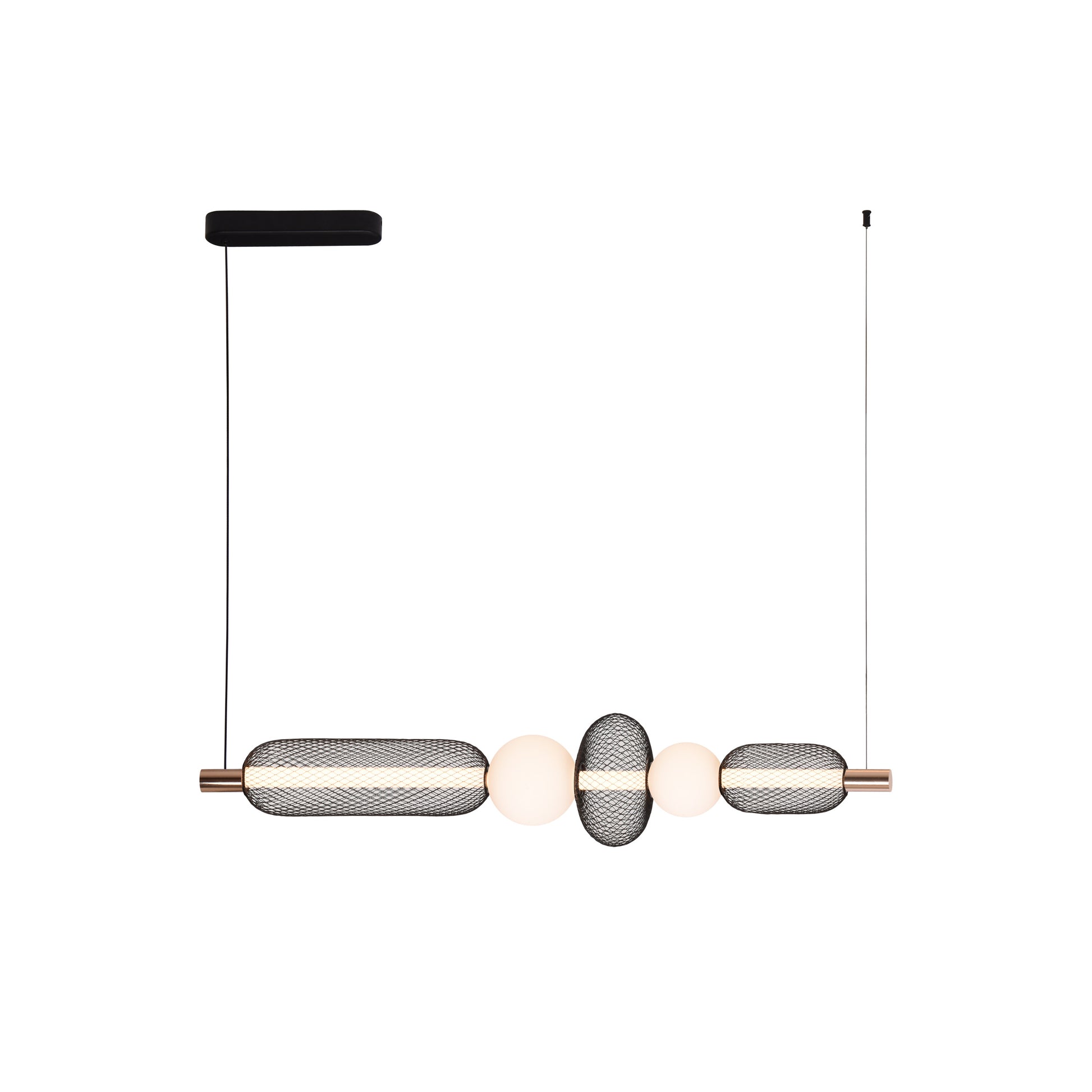 This exquisite linear pendant light is a captivating blend of modern artistry and timeless elegance. Its design, featuring a delicate white glass sphere suspended within a black metal frame, creates a mesmerizing interplay of light and shadow. The pendant's minimalist design, suspended by slender cables, exudes a sense of understated elegance. It is a statement piece that effortlessly elevates any interior space, bringing a touch of contemporary glamour to your home.